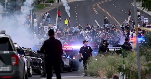 A Spokane Police Department officer spoke over the regional SWAT car speaker system at 7:13 p.m. and ordered everyone present to disperse. The officer gave the demonstrators five minutes to do so. Few left the scene when police warned at 7:22 p.m. that they would use force if the crowd did not leave.
