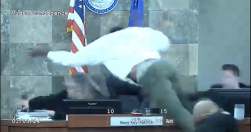 The video shows Judge Holthus denying Redden’s request for probation due to his criminal history and preparing to sentence him to jail time. Redden can be seen then leaping over the judge’s bench to tackle her.