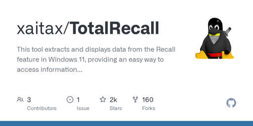 salarua@sopuli.xyz to Technology@lemmy.worldEnglish · 2 years agoxaitax/TotalRecall: This tool extracts and displays data from the Recall feature in Windows 11, providing an easy way to access information about your PC's activity snapshots.plus-squaregithub.comexternal-linkmessage-square2fedilinkarrow-up10arrow-down10